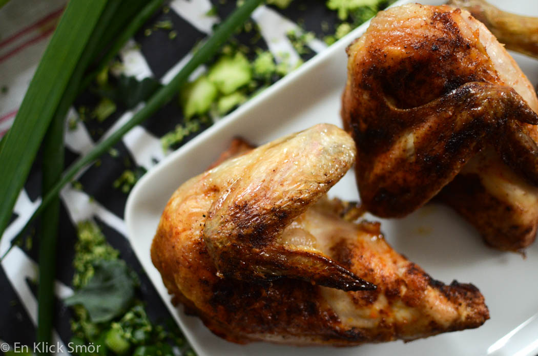 När jag tillagar kycklig brukar jag ofta dela den redan innan tillagning. Det är ingen expertstycking, jag delar den i fyra delar, kryddar och saltar ordentligt på skinnet så att det ska bli krispigt. Det går också snabbare att laga.