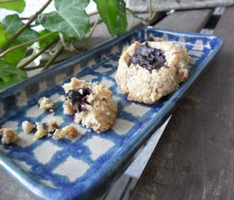 Sätt ugnen på 150 grader. Finhacka pecannötterna och blanda med resterande torra ingredienser. Blanda därefter ner smörer och blanda till en kakdeg. Forma kakdegen till runda bollar på en plåt med bakplåtspapper. Gör en grop i varje boll. Fördela blåbärssylten i varje grop. Grädda mitt i ugnen i ca 12 minuter.