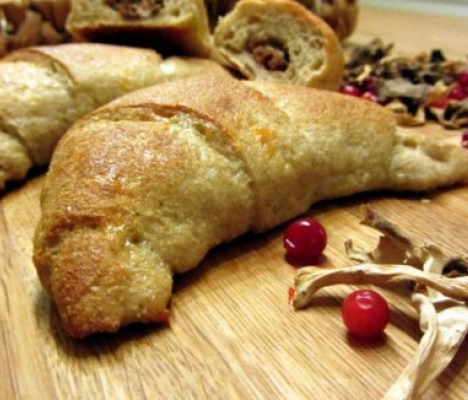 Fyllning: Lägg trattkantareller i blöt så att de får svälla i åtminstone 10 minuter . Stek köttfärsen i lite smör under tiden . Blanda lingonen med sukrinet i en liten skål . Lägg den stekta köttfärsen åt sidan och krama sedan ur trattkantarellerna och hacka dem i småbitar . Fräs dem sedan i resten av smöret och blanda därefter ner den stekta köttfärsen och lingonröran . Låt puttra ett litet tag och tillsätt sedan crème fraichen och rör runt . När du tagit av röran från spisen rör du i en äggula.
