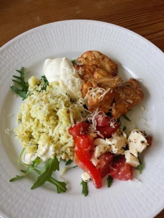 Till detta serverade jag blomkålsris med chiliflaks och en majonnäs-sås enbart med salt och peppar och en tomat- och rucolasallad.