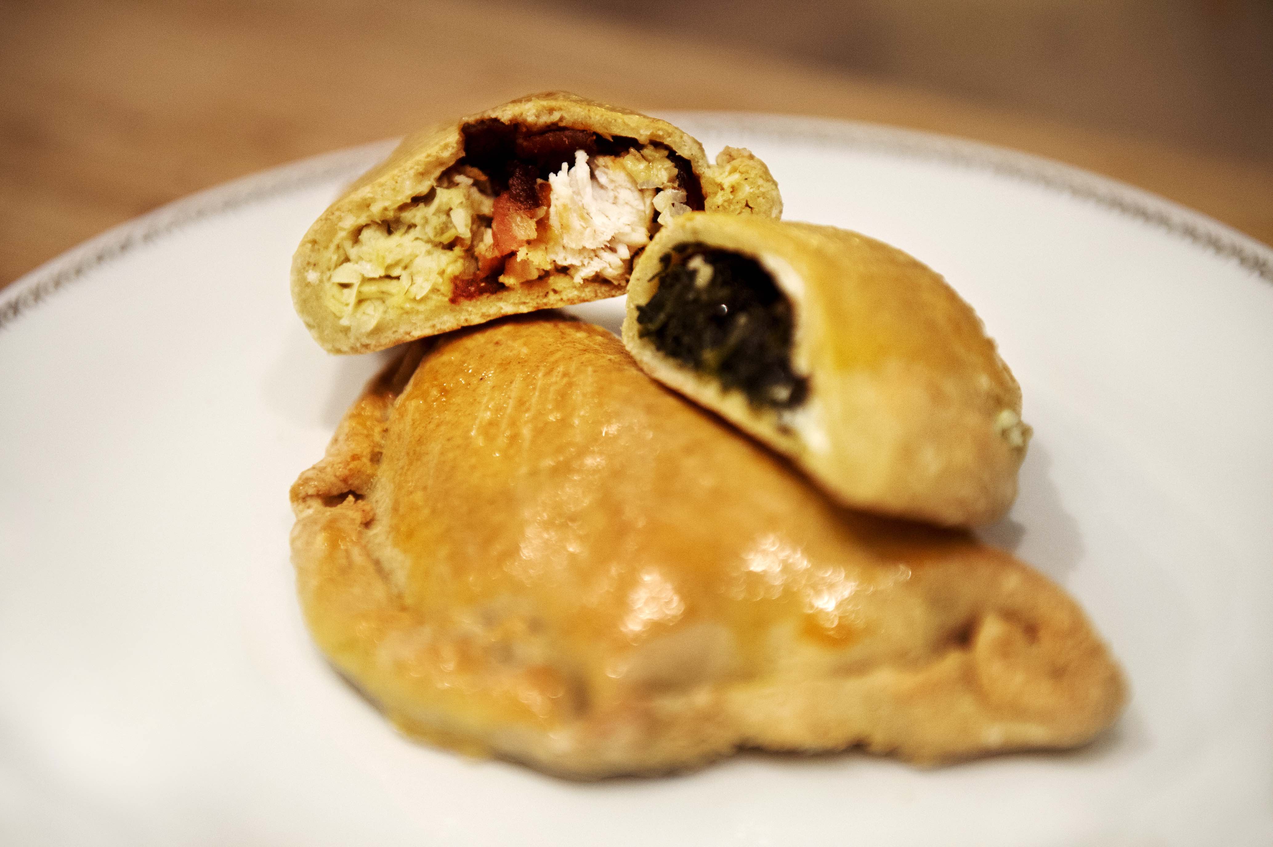 Blanda alla torra ingredienser till degen i en matberedare eller med elvisp • Tillsätt äggen ett och ett • Häll i kokosoljan och mixa eller vispa allt till en smidig deg • Låt stå i kylen i ca 30 minuter medan du gör fyllningarna. Fyllning 1: Om du använder fryst spenat, tina den och pressa ur vätskan • Stek rödlöken mjuk och tillsätt spenat, honung och kryddor • Låt svalna • Tillsätt fetaosten när fyllningen läggs i degen. Fyllning 2: Krydda kycklingfiléerna och stek hela tills de är genomstekta • Stek bacon krispigt och låt svalna • Mixa kronärtskockshjärtan med salt och peppar • Skär kycklingfiléerna och bacon i mindre bitar • Bottna med kronärtskockshjärtan och varva med kyckling och bacon när du ska fylla degen • Strö över lite persilja. Sätt ugnen på 200 grader • Ta ut degen ur kylen • Forma till en rulle, skär i åtta delar och forma till bollar • Lägg bollarna en och en på bakplåtspapper • Tryck till, vik över bakplåtspapper och kavla ut degen mellan pappret så att den inte fastnar på kaveln • När den är lagom tunn lägger du fyllningen i mitten • Vik över andra halvan av degen med pappret, vik in kanterna och tryck till kanterna ordentligt med fingrarna eller med en gaffel • Pensla med äggula och grädda i ugnen i ca 15 minuter eller tills de är gyllene.