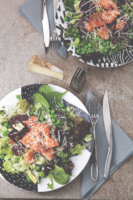 Lägg sallad i botten på tallrikarna, krossa bondbönorna grovt och strössla över dem tillsammans med ärterna. Lägg sallads­löken över salladen. Lägg ut rödbetorna på tallriken. Dela laxen grovt med fingrarna och lägg den i mitten på tallriken.