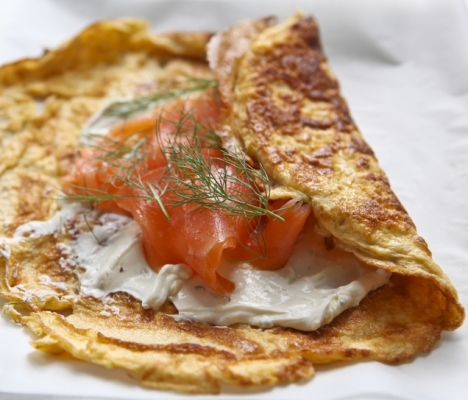 Vispa ihop ingredienserna. Slå i en panna med en klick smör. Stek så wrapen stelnar och vänd sedan med bred stekspade! Stjälp upp på fat eller tallrik. Fyll sedan med favoritfyllning, rulla ihop. Här med lax och cream cheese.